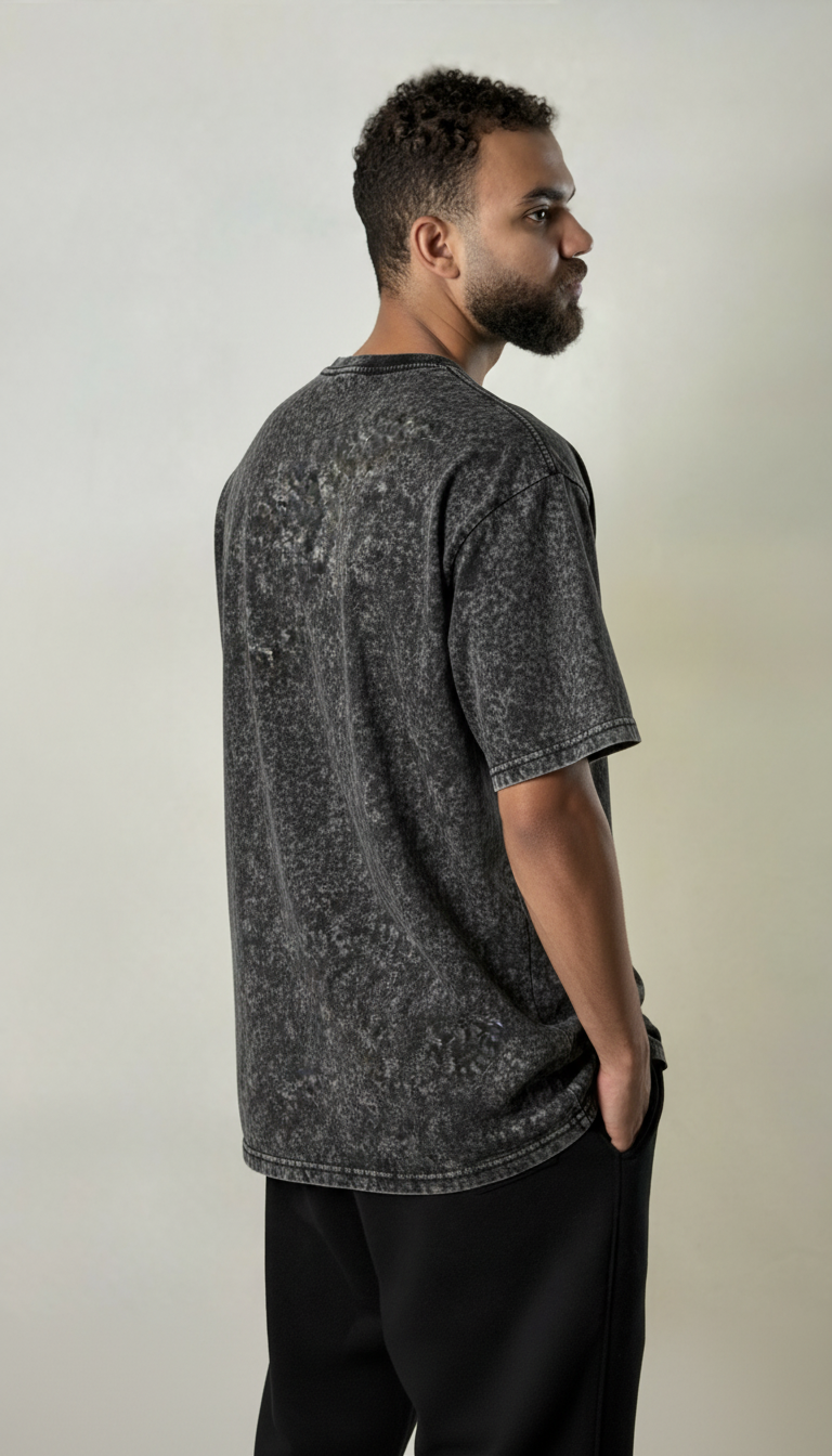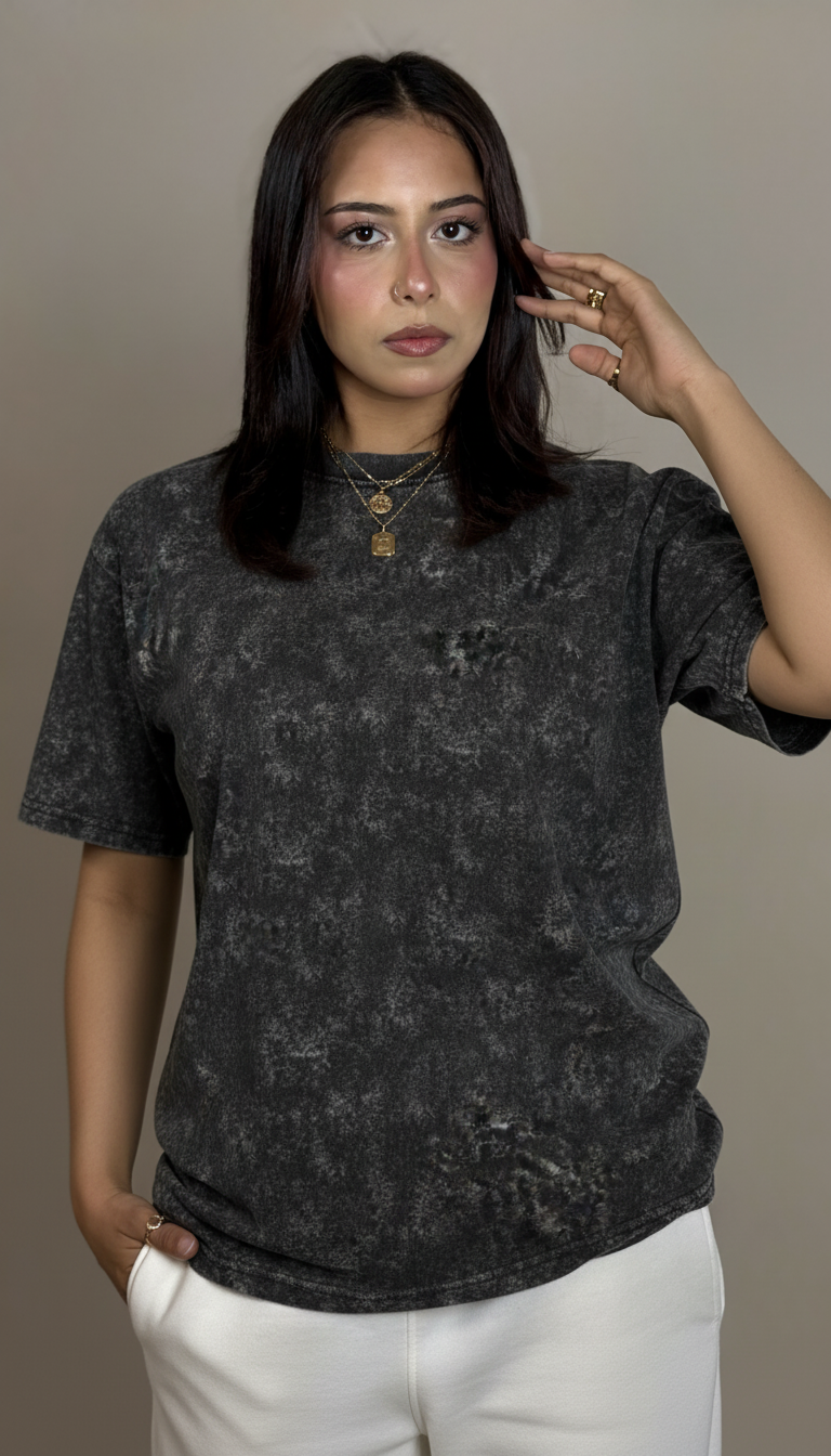 Not your average black tee. The stone-wash finish gives it that faded, vintage edge — every piece slightly unique, always effortlessly cool.